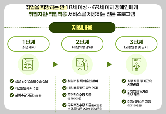 단순한 일자리 연결을 넘어 상담 → 훈련 → 취업 → 사후관리까지 전 과정이 체계적으로 구성되어 있어, 안정적인 사회 진입을 원하는 장애인이라면 반드시 알아두어야 할 프로그램입니다.