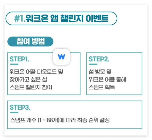 - 모바일앱인 '워*온' 인증 챌린지 : 섬 방문 인증하면 참여 횟수에 따라 다양한 경품 증정