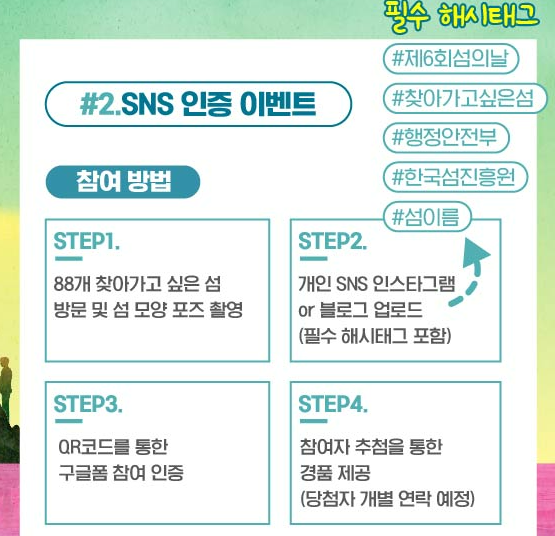 - 개인 SNS에 섬 방문 인증 : 섬 방문 사진과 함께 섬 이름이나, '찾아가고 싶은 섬' 등 지정된 해시태그를