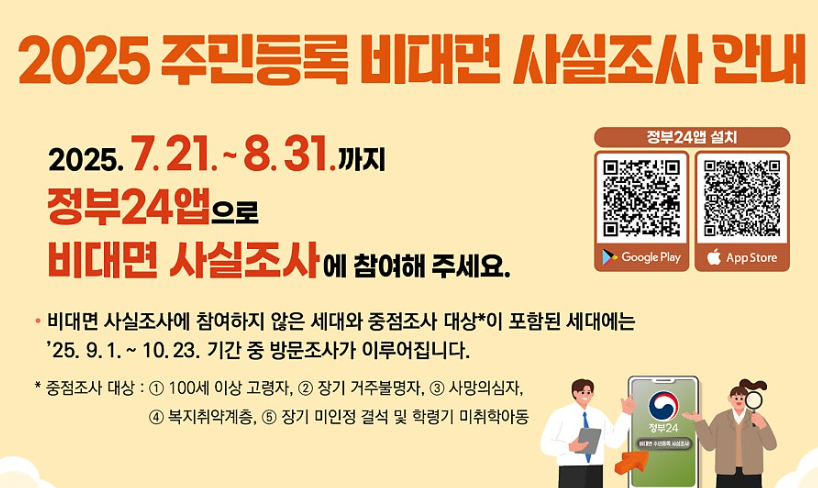 2025년 주민등록 사실조사는 7월 21일부터 10월 23일까지 진행되며, 특히 비대면 조사는 8월 31일까지 반드시 참여하는 것이 좋습니다.